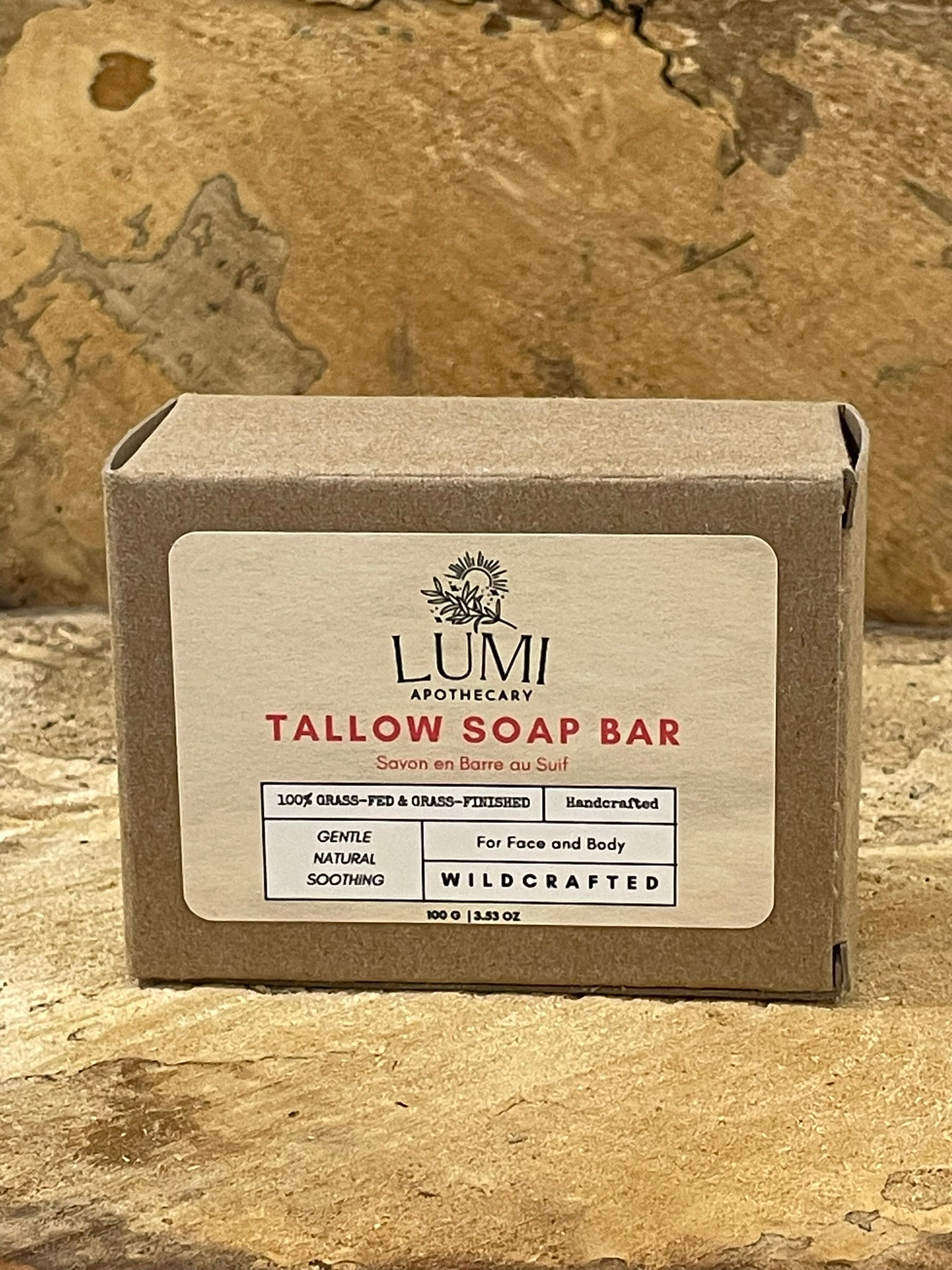 Our Tallow Soap Bar is an herbal preparation made from dried leaves of Burdock (Arctium), flowers of Calendula (Calendula Officinalis), leaves of Plantain (Plantago Major), flowers of Chamomile (Matricaria Chamomilla), and Lavender (Lavandula Angustifolia), infused in extra virgin olive oil and coconut oil for at least six weeks. Carefully composed to offer moisturizing, hydrating, and nourishing benefits to your skin.