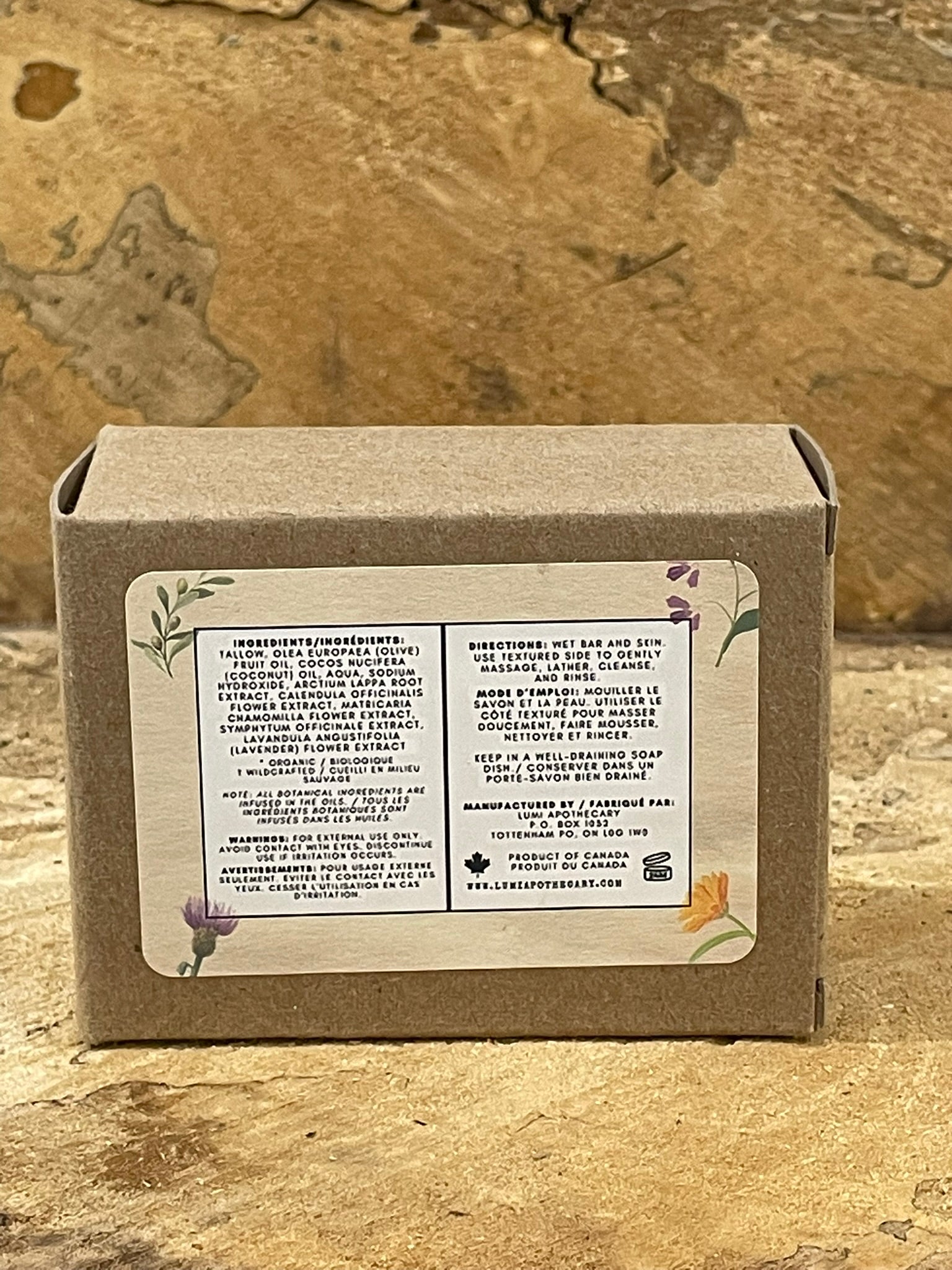 · 100% wildcrafted and/or ethically sourced Burdock (Arctium), Calendula (Calendula Officinalis), Plantain (Plantago Major), Chamomile (Matricaria Chamomilla), Lavender (Lavandula Angustifolia) infused in